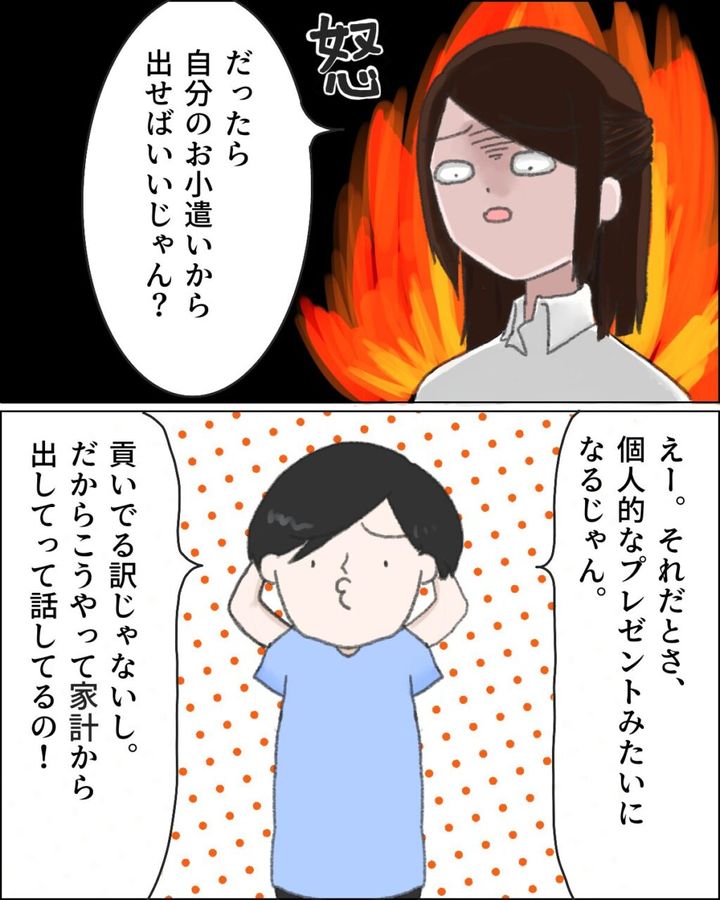 「だったら自分のお小遣いから出せばいいじゃん?」と怒って言うと、「えー。それだとさ、個人的なプレゼントみたいになるじゃん。貢いでる訳じゃないし。だからこうやって家計から出してって話してるの!」と言い、