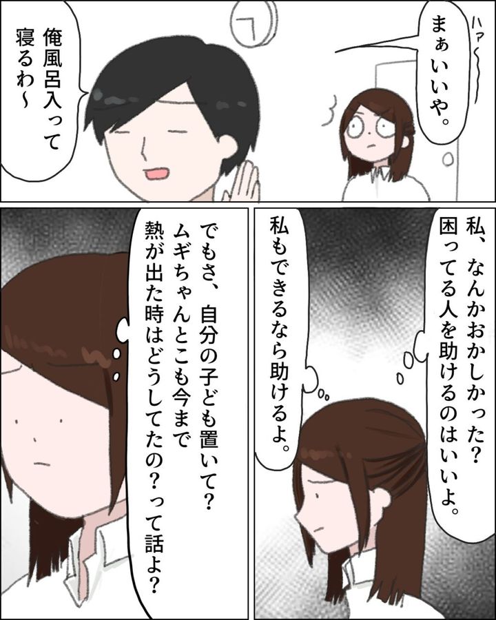 「ハァーー・・まぁいいや。俺風呂入って寝るわ~」そう言ってさっさと行ってしまう夫を見て、「私、なんかおかしかった?困ってる人を助けるのはいいよ。私もできるなら助けるよ。でもさ、自分の子どもおいて?ムギちゃんとこも今まで熱が出た時はどうしてたの?って話よ?」と心の中で呟く私。