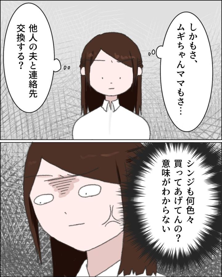 「しかもさ、ムギちゃんママもさ・・他人の夫と連絡先交換する?シンジも何色々買ってあげてんの?意味がわからない」と怒りが沸々とこみ上げてきました。