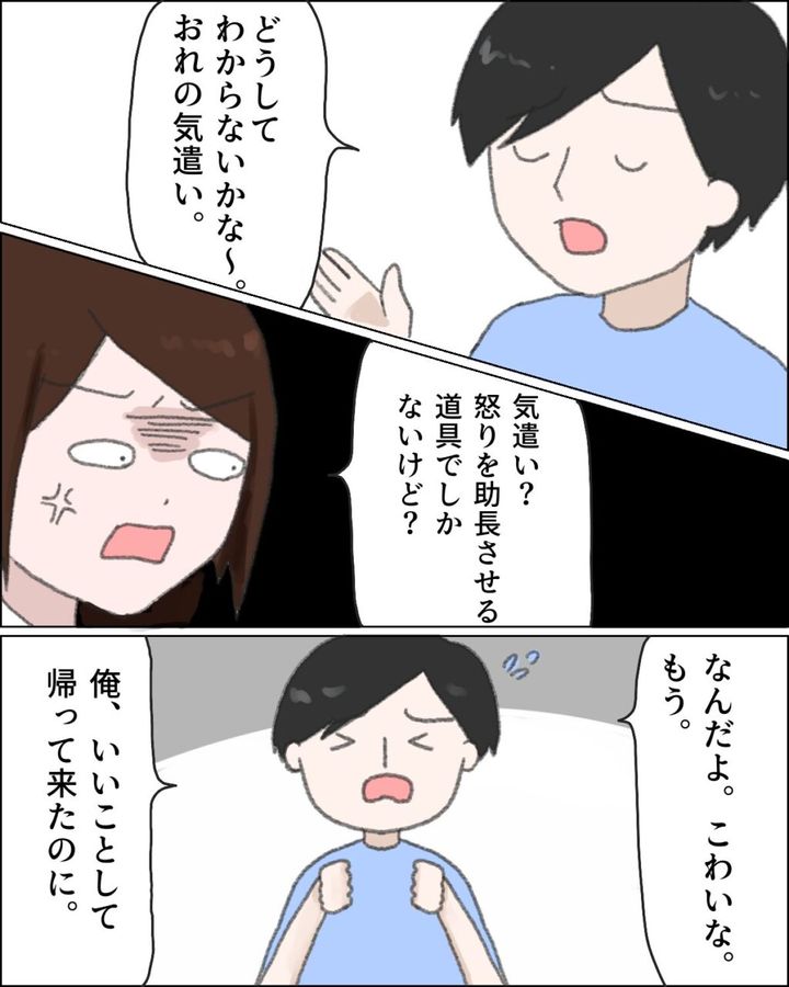 「どうしてわからないかな~。おれの気遣い」と開き直る夫に、「気遣い?怒りを助長させる道具でしかないけど?」とキレる私に、「なんだよ。こわいな。もう。俺、いいことして帰って来たのに」と言い、