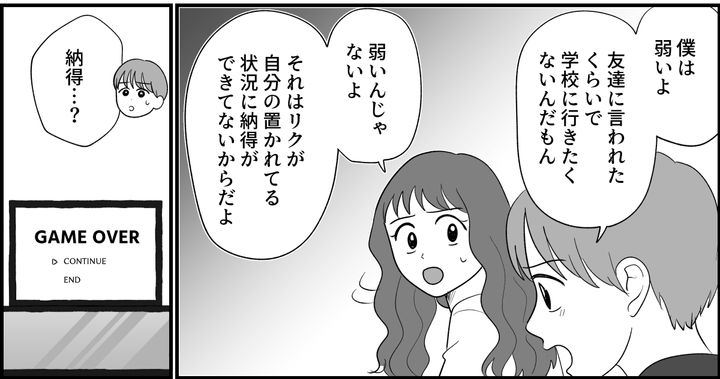 私(ハルナ)は、夫のトモアキと2人暮らし。法律上の「結婚」という形も素晴らしいとは思いますが、私たちはそういう形にこだわらない生活を送りたいねと話し合い、事実婚に落ち着いたのでした。トモアキとは趣味がバッチリ合うので、一緒にいて本当に話題が尽きないし、楽しいです! そんな中、兄の息子リクが学校に行けていないという話を聞きました。実家にリクが遊びに来ているときに会いに行くと、リクは私の家にあるテレビやゲームで遊ばせてほしいと言ってきたのです。しかも母親であるナナミさんには隠して……。私は悩んだ末に、リクの要望を受け入れることにしました。その代わり、必ず自分でナナミさんに話をすることが条件。一緒にゲームで遊んでいると、リクは学校に行けなくなってしまった理由を話してくれたのでした。