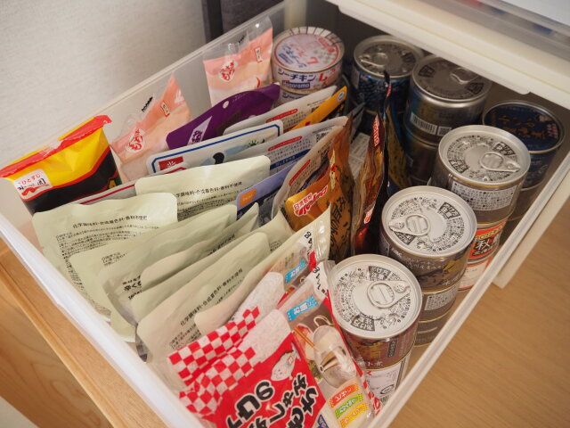 そして、気づいたら家族が食べてしまっている!そんな方は、普段の食品ストックとは別に分けて収納してみましょう。分けて収納することで分散収納に繋がり「備えたのに取りだせない!」などのリスクを減らすことができます。我が家も賞味期限の長めのものは普段の食品ストックとは別に、押し入れに収納しています。