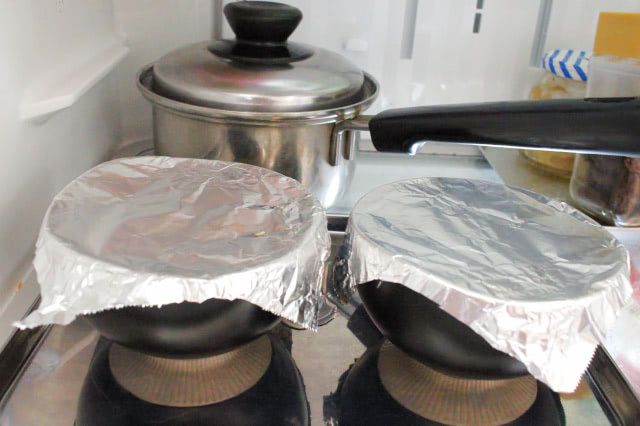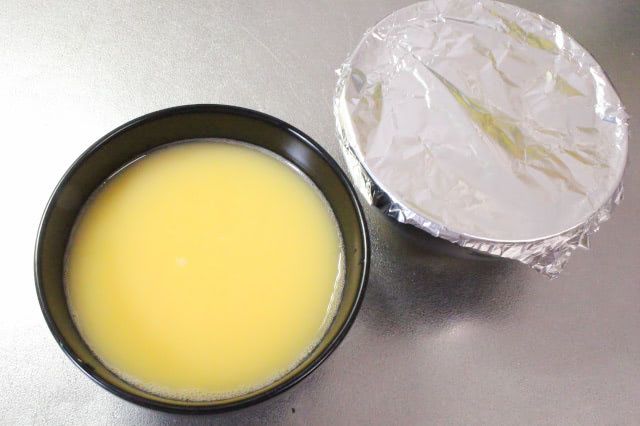 表面に浮いた細かい泡をスプーンで取り除くと仕上がりが美しくなりますよ。フタ付きの茶碗蒸しの器を持っていないので、お茶碗に卵液を注ぎ、アルミホイルを被せて蒸します。
