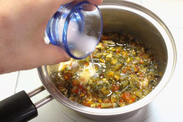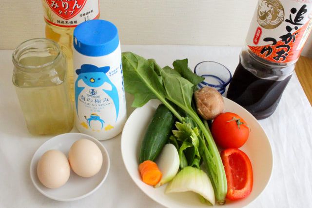 今回は刻んだ野菜の量を見て、2倍濃縮のめんつゆと水を100mlずつ混ぜためんつゆ(200ml)を加えることにしました。