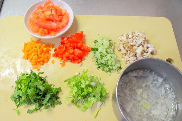 フードプロセッサーを持っていないので、今回は包丁ですべての野菜をみじん切りにしました。玉ねぎは水にさっと晒して水気を切りました。
