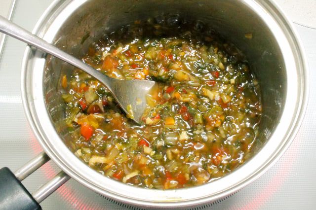 弱めの中火に点火して混ぜると、どろっとした野菜餡に。めんつゆで煮込んだのでくすんだ色の餡ですが、パプリカやにんじんの赤色がアクセントになっています♪