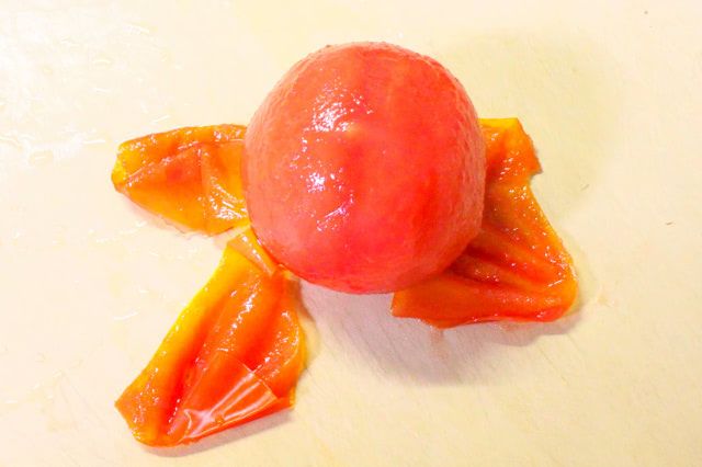トマトの皮は口当たりが悪いので湯むきします。十字に浅く切り込みを入れたトマトを熱湯で30秒ほど茹で、すぐに冷水に取ると簡単に剥けました。