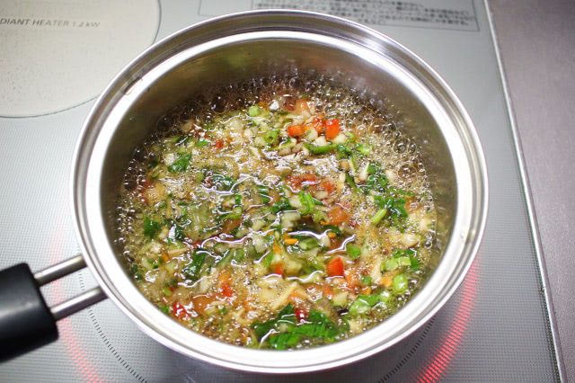今回の茶碗蒸しには具が入っていないので、野菜餡を濃いめに味付けし、どろっとした餡に仕上げます。野菜の煮込み時間も不明だったため、めんつゆがある程度煮詰まるまで、中火で17分ほど煮込みました。