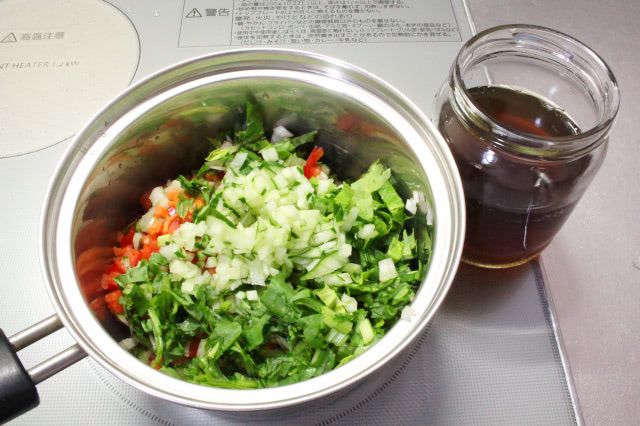 4. 3、玉ねぎ、にんじん、ほうれん草、セロリ、パプリカ、きゅうり、しいたけをフードプロセッサーで細かく切ります。