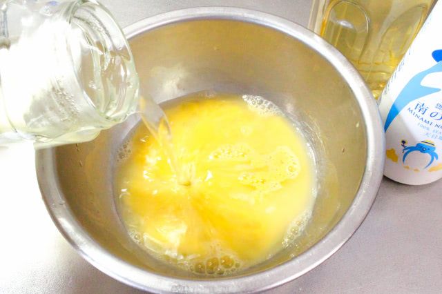 今回は、お湯360mlに和風だしの素2gと昆布だしの素1gを溶かし、粗熱を取った合わせだしを使用。塩とみりんを各少々加えて、泡立てないように静かに混ぜました。