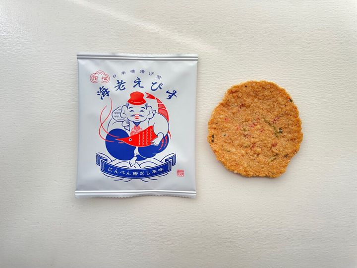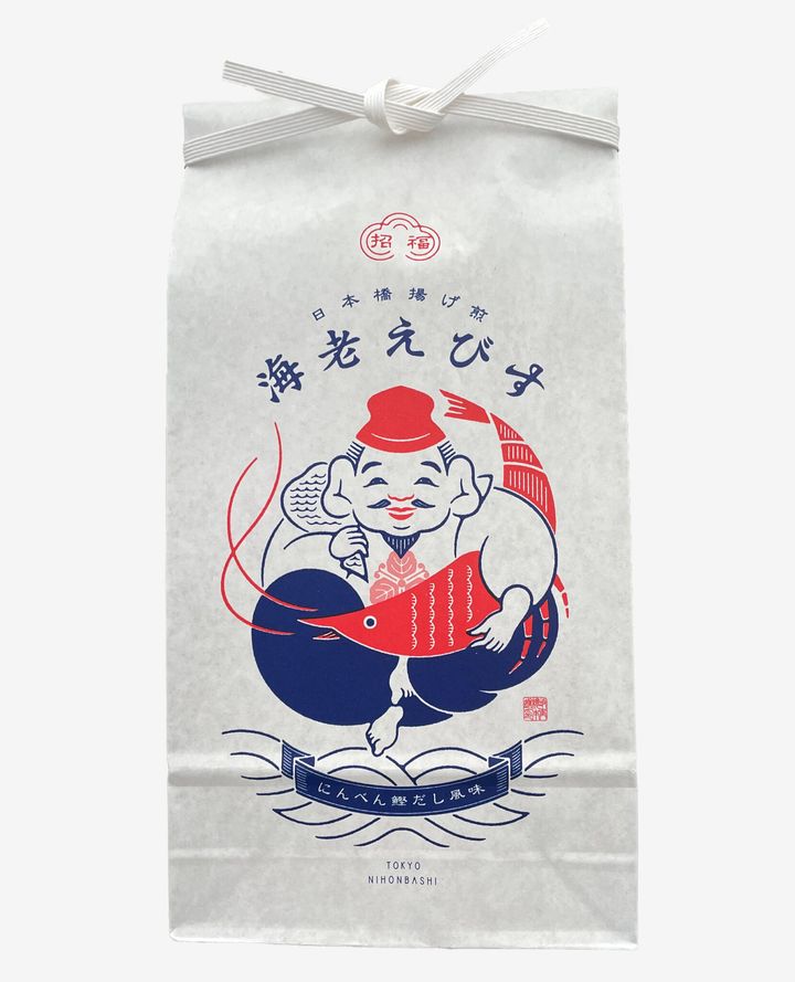 さて、手みやげ通のみなさま、日本橋限定(日本橋髙島屋と日本橋三越本店で扱う)の海老せんがあるのをご存じでしょうか。国産芝海老と天然海老の旨み、甘みに加え、日本橋の老舗「にんべん」の鰹枯節だしを利かせた天ぷら風海老せんです。国産三つ葉を加え(ところどころに小さな緑が見える)、国産の米油でからりと揚げてあるそう。軽い、しかも大きくて堂々たるお姿。1枚ずつ、めでたいえびす様付きのパッケージに入っていて、福が来てくれそうな予感。