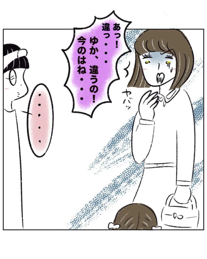 ついさっき娘のゆかちゃんからちくちく言葉を注意されたことを思い出しハッとしたゆかちゃんママは「あっ!違っ・・ゆか、違うの!今のはね・・」とあたふた。その様子を無言で見つめていたまるさんは、