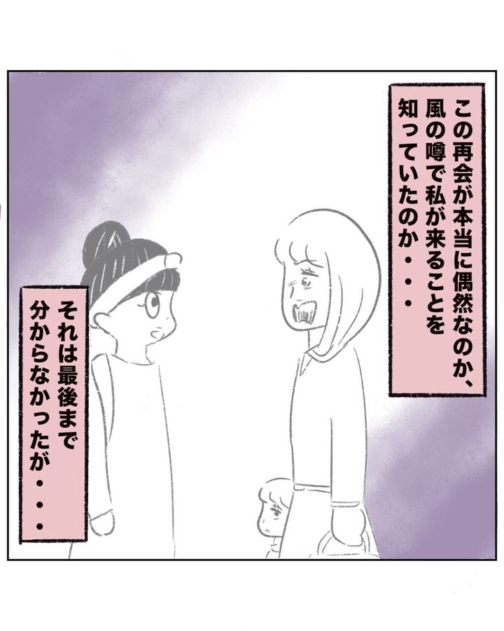 児童館で出会った空気を読まず、話も通じず、自分のこだわりを周りに押しつけたり、やたらとマウントを取ってくるゆかちゃんママから恐怖を感じるほど執着されて悩んでいたまるさん。その後、夫の急な転勤で県外に引っ越したまるさんは、もうゆかちゃんママに会うことはないと安堵していました。しかし一年後、仲良しだったマキちゃんママたちに会うために公園へ行くと、そこへ突然ゆかちゃんママが現れました。ゆかちゃんママは相変わらずマウントを取ってきて失礼な言動ばかり。まるさんが毅然とした態度で言い返すと、娘のゆかちゃんに「ママ、ちくちく言葉いっぱい言われちゃった!」と泣きついたゆかちゃんママでしたが、「ママもたくさんちくちくしてたよ。ダメだよ」と正論で返されてしまいます。そしてゆかちゃんから「ごめんなさいして」と強く言われ観念したゆかちゃんママは「ごめんなさい」とまるさんに謝りました。すると、遠くで遊ぶアキくんたちを見たゆかちゃんが「いいなぁ。ゆかちゃんも公園で遊びたいなぁ」と羨ましそうにポツリ。「なんでゆかちゃん遊べないの?なんでお教室ばっかなの?」と素朴な疑問をぶつけられたゆかちゃんママは言葉に詰まり「ゆかのためなの!民度の低いお友達はいらないの!」と声を荒げると、「もう行くよ!」と言ってそそくさと立ち去ろうとしました。ママに手を引かれながらにっこり笑って手を振るゆかちゃんにまるさんがほっこりしていると、急にゆかちゃんママが振り返って「なに見てんねん!ウザ!」と吐き捨てました。