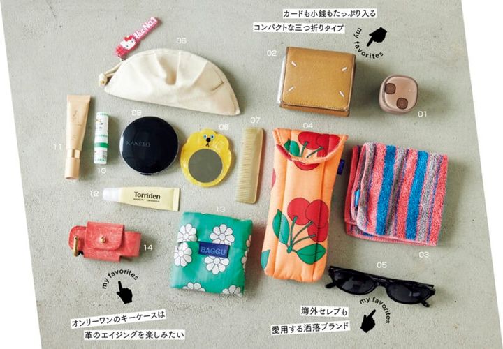 01ワイヤレスイヤホンはオーディオテクニカ。音質がとてもいいです。02メゾン マルジェラの財布は夫からのプレゼント。外側に小銭入れがあるので使いやすい。03色合いがお洒落なヒポポタマスのハンカチ。04バグゥのパフィーグラススリーブは、サングラス入れとして活用。05ボニークライドのサングラスはオーバルデザインが今っぽくてヘビロテ中。06宇都宮のお土産でもらった餃子モチーフのポーチの中には、コスメや実用的アイテムをIN。07くし、08トレスのミラー、09化粧ヨレをカバーするカネボウのパウダー、10タイのお土産でもらったアロマノーズミント、11すっぴんに血色感を与えてくれるリーカのリップグロス、12こってり感が気に入ってるトリデンの保湿リップを入れて持ち歩きます。13お花柄が可愛いバグゥのエコバッグ。14同じ事務所の岩本大樹さん手作りのレザーのキーケース。夫と色違いです。