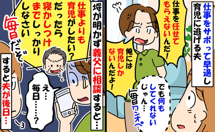 仕事をサボって育児をしたがる夫に義父が「じゃあ朝から晩まで毎日しなさい」私に押し付けていた夫は