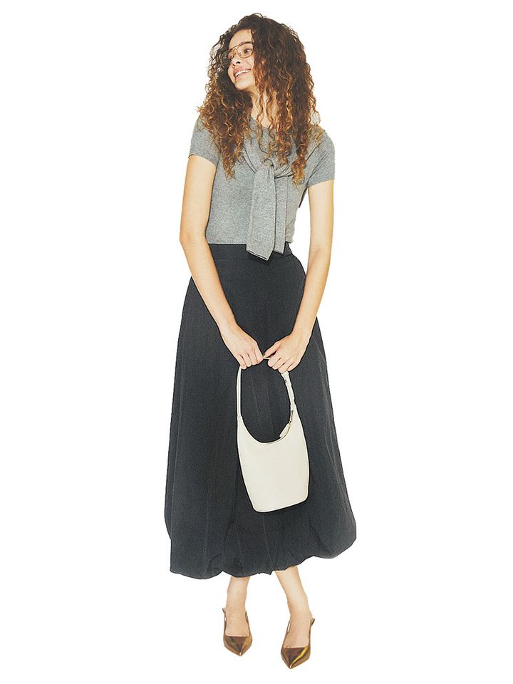 【POINT】タイトなTシャツに同素材のカーディガンを重ね、ニットの間のびを防ぐ立体感をメイク。素材のやさしさ、ショート丈のキレのよさ、どちらも生かせる中間色のグレーで採用。
