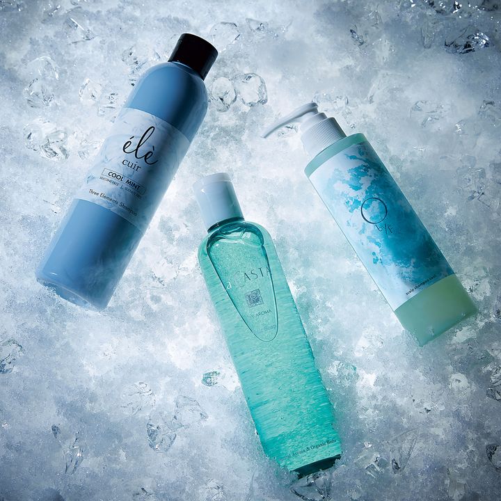 左から:ミント配合でクールな使用感。ベタつきをリフレッシュ。ele cuir スリーエレメントシャンプー M&L 300ml ¥2,970※数量限定(ビープル)弾力泡で爽快に洗い上げる。ダメージを受けた髪にも優しい弱酸性。ラ・カスタ アイシーアロマ ヘアソープ 300ml ¥2,420※数量限定(アルペンローゼ)頭皮のこもり熱をリセット。頭皮ケア、トリートメントも叶う3in1シャンプー。O by F スキャルプシャンプー クール 200ml ¥3,080※数量限定(ビープル)