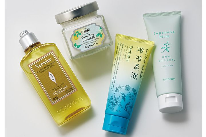 左から:みずみずしいジェル。冷蔵庫で冷やすとさらにクールに。ロクシタン ヴァーベナ アイシーボディジェル 250ml ¥4,730※数量限定(ロクシタン ジャポン)清涼感のあるフレッシュな使い心地。ボディ&ハンドジュレ スパークリング・ユズ 200ml ¥5,060※数量限定(SABON Japan)和種ハッカ由来のメントールでパワフルな冷涼さが持続。FRENAVA natural & organic クールミントボディミルク 冷冷柔液 100g ¥2,200※数量限定(ビープル)爽快感に包まれて巡りをサポート。自然なめぐりジェル。リフレッシュジェルクリーム 120g ¥2,310(ナチュラルアイランド)