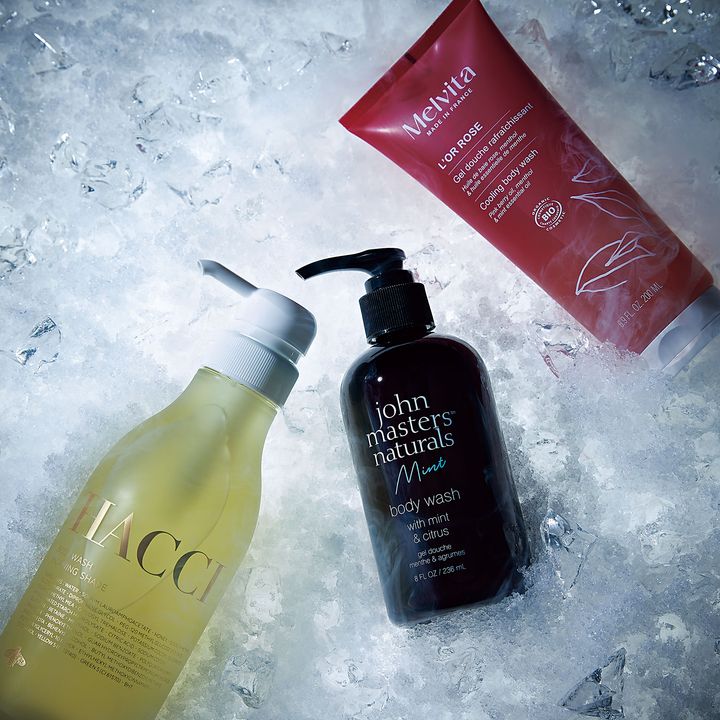 左から:森の中にいるような香りと涼しさを感じる洗い上がり。ボディウォッシュ BEE HUG モーニングシェイド 385ml ¥5,940※数量限定(HACCI)スッとするミントの香りと洗った後の爽快感が暑さを和らげる。M&Cボディウォッシュ ミント 236ml ¥3,190※数量限定(ジョンマスターオーガニック)ピンクペッパーエキスでボディをキュッと引き締めながら、クールに整える。ロルロゼ クーリング ボディウォッシュ 200ml ¥2,970(メルヴィータジャポン)
