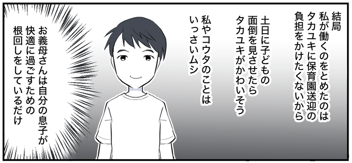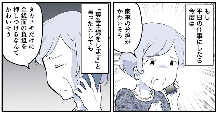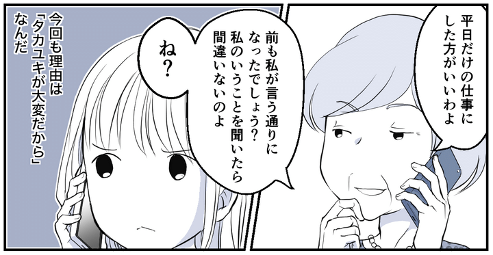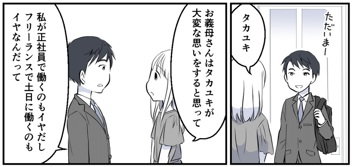 タカユキにも「あなた、お義母さんはあなたが大変な思いをすると思って、私が正社員で働くのもイヤだしフリーランスで土日に働くのもイヤなんだって」と、あえて嫌味っぽくならないように伝えました。