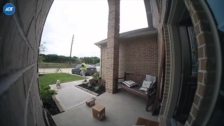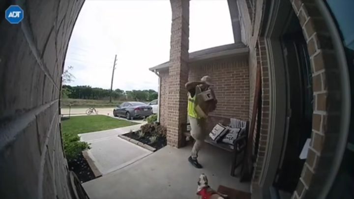 犬にびっくりしてパニックになった配達員さんの、思いのほか俊敏なリアクションはこちらの動画で見ることができます。