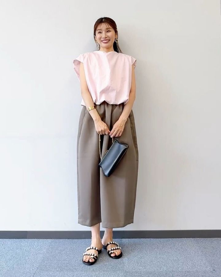 甘くなりがちなピンクですが、こちらは大人っぽさを残した絶妙な淡いピンク。甘さを抑えて上品に仕上がります。ややハリ感のある素材で、身体のラインを拾いにくく”きちんと感”と体型カバーを両立。オフィスでも活躍のトップスです。