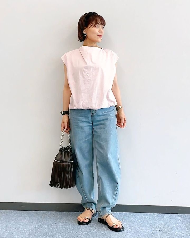 ②【149cm YUKIEさん】デニムコーデもピンクトップスなら女性らしい