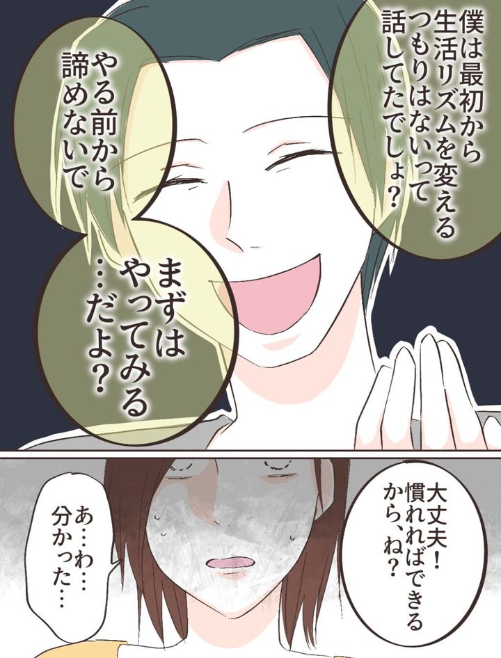 その後笑顔に戻ったものの、「僕は最初から生活リズムを変えるつもりはないって話してたでしょ?やる前から諦めないで。まずはやってみる・・だよ?」と諭すように言いました。