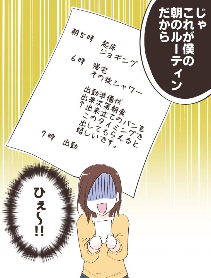 そして、「じゃ、これが僕の朝のルーティンだから」と渡されたのはリヒトさんの予定表!ジョギング後、シャワーを浴びている間にパンを焼き、出来立てを出して欲しいと書かれていて「ひぇ~!!」と顔面蒼白に。
