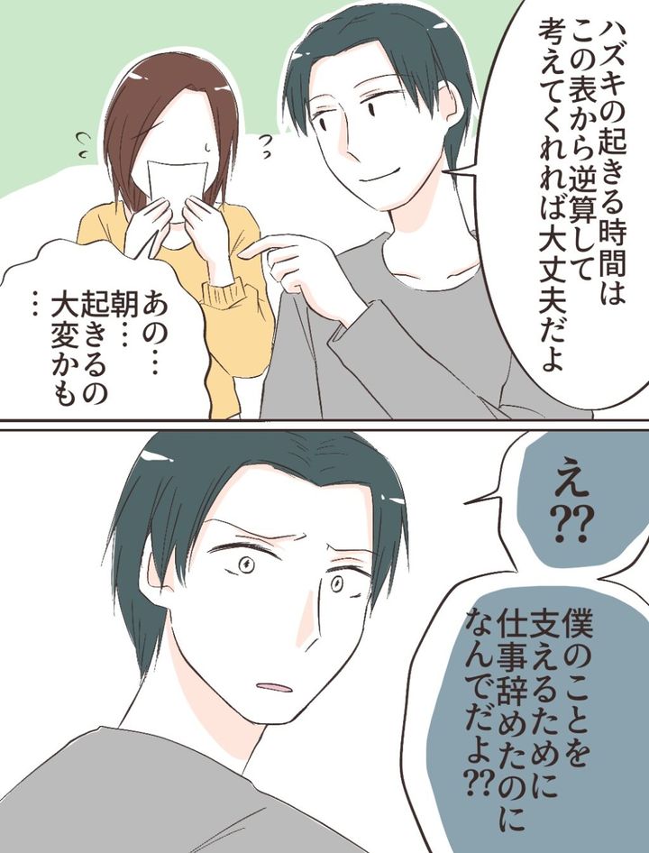 すると、「ハズキの起きる時間は、この表から逆算して考えてくれれば大丈夫だよ」と言われ、「あの・・朝・・起きるの大変かも」と答えると、「え??僕のことを支えるために仕事辞めたのになんでだよ??」と険しい表情に。
