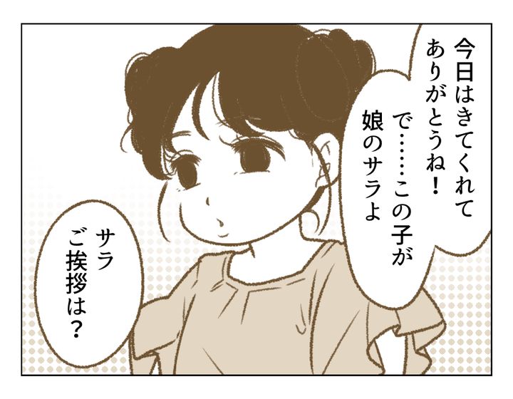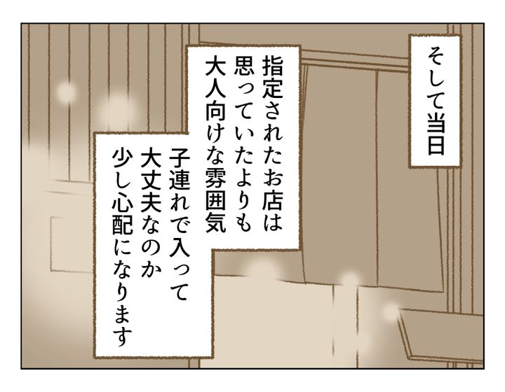 指定された場所は、都心にある居酒屋さん。居酒屋といってもファミリーで楽しめるようなお店でなく、どちらかというと大人だけでしっとりと飲むような落ち着いた雰囲気のお店でした。「こんなお店に子連れで……?」と不安になるミキさんでしたが、完全個室ということと、ミキさんの子が大人しくしていられるタイプだということもあり、「まぁ大丈夫かな」と判断したようです。そしてエリナさんが現れ、久々の対面。エリナさんの子ども・サラちゃんに会うのは初めてでしたが……挨拶をしてくれず、ちょっと人見知りな様子です。