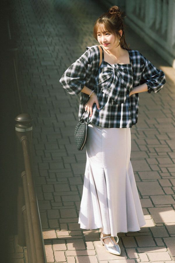 胸元のリボンが甘さをキープ。クールな黒チェックでいつものレディ服とのギャップを楽しんで。