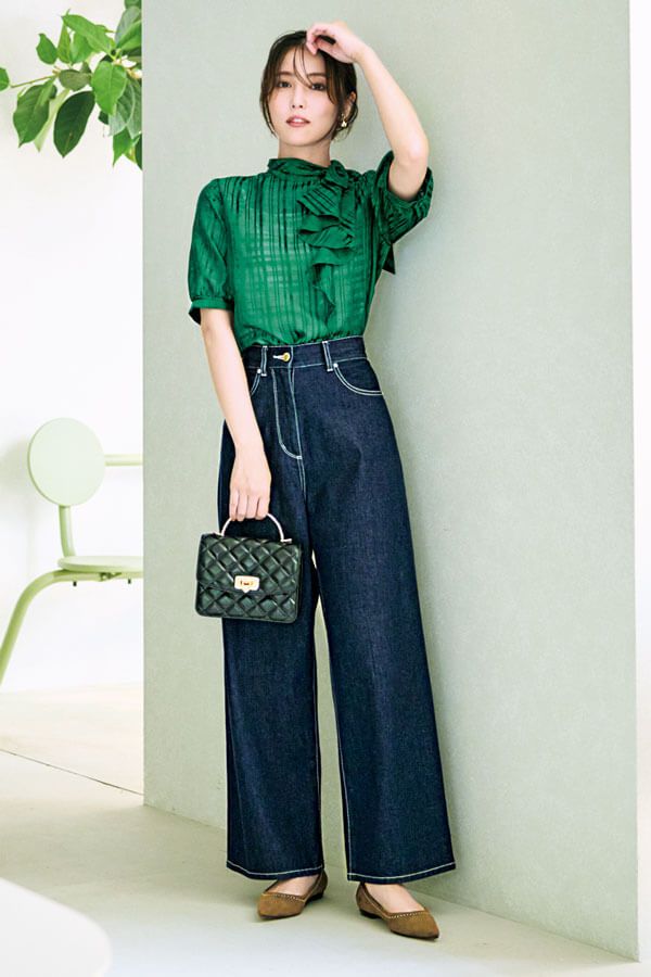 こっくり秋色のブラウスと、デニムのクラシカルコーデでひと足お先に秋のおしゃれを獲得。エレガントな片リボントップスにデニムで優雅な抜け感をひとさじ与えて。