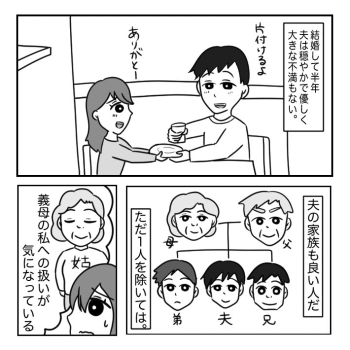 主人公は結婚して半年。夫も優しくて平和な日々を送っていました。しかし、義母の対応だけがどうしても気になっているようで・・・。