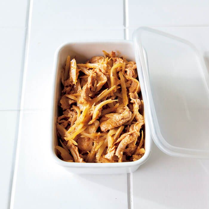 甘辛いポークチャップ炒めをごぼうでボリュームUP! ごぼうの風味で和テイストな作り置きおかずに様変わり。