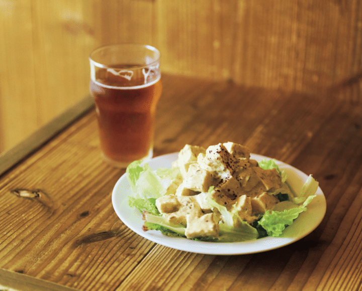 イシイには4つのタップがあり、1つ打ち抜かれるたびに新しいビール樽につなぎ替える。つまみに選んだのはコロネーションチキン700円。
