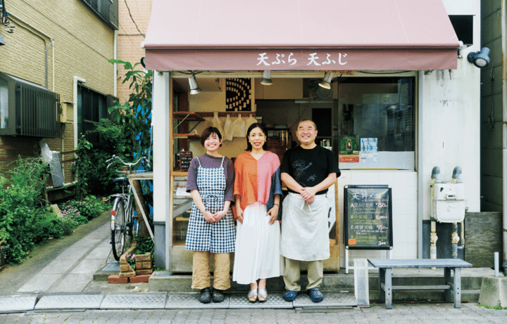 定番のキス天やイカ天をはじめ、穴子や真いわし、メヒカリなど、その日の仕入れによって変わる具材も。野菜天は、なす、かぼちゃ、いんげん、まいたけのほか、夏季限定のもずく天も人気。天丼をテイクアウトする人も多く、海老、キス、かき揚げ、野菜天をのせた「天ふじ天丼」が750円、好みの具材を選ぶ「おこのみ天丼」は天ぷら代+300円で作ってもらえる。