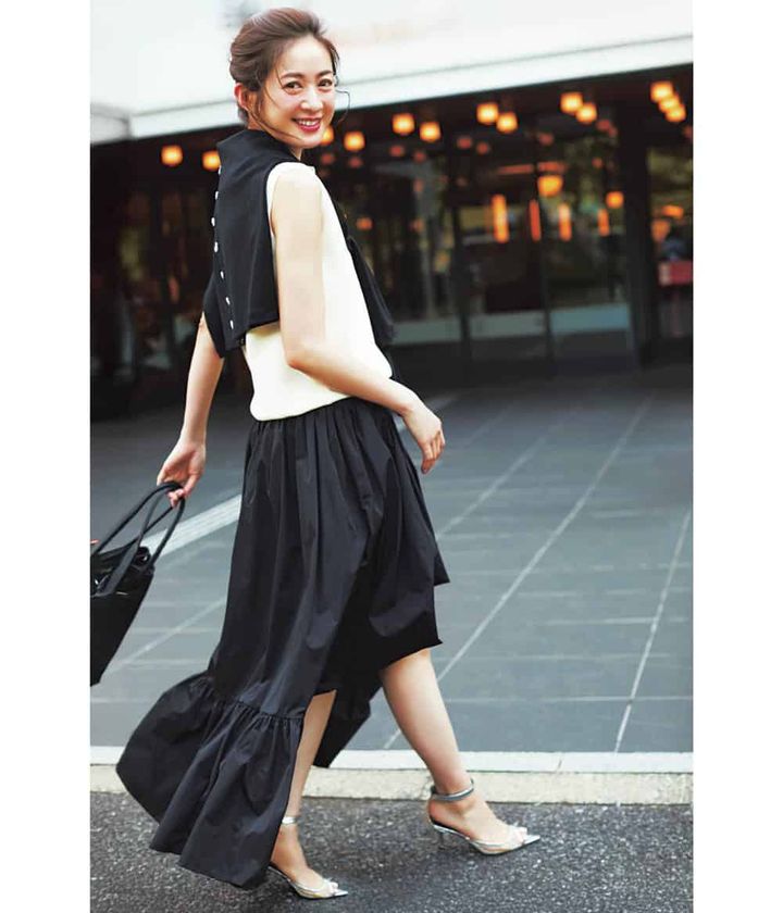 3. 大人の脚見せは、前後差がドラマチックな余韻を残す【黒スカート】で