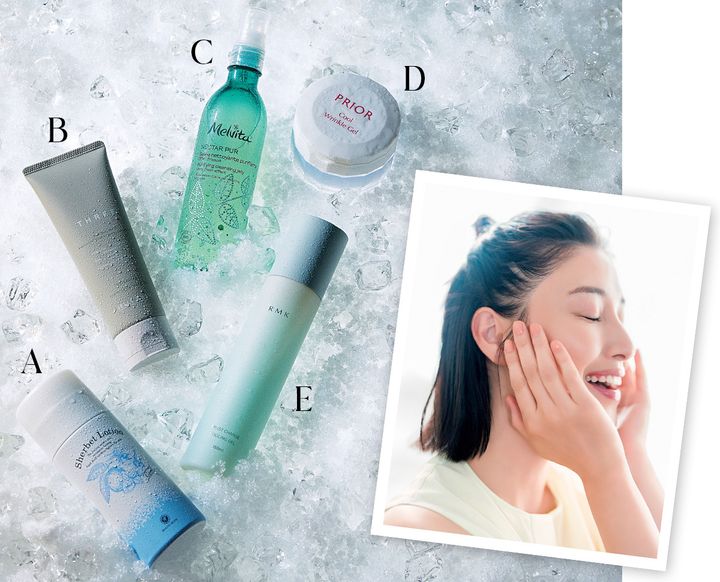 A コットンにとり肌に塗布。−6℃の超冷感で肌を瞬時に引き締める。ハウス オブ ローゼ シャーベットローション 95g ¥1,980※限定(ハウス オブ ローゼ)B スペアミント精油配合のスクラブジェル。ひんやりと広がりクリアな肌に。バランシングステム ジェリー ウォッシュ MJ 100g ¥4,510(限定、THREE)C ミントの爽やかさに包まれながら過剰な皮脂や汚れをオフするジェル状洗顔料。ネクターピュア ジェリーウォッシュ 200ml ¥3,300(メルヴィータジャポン)D 濃厚な冷感ジェルで、シワ改善も叶う。プリオール 薬用 冷やしリンクル美コルセットゲル[医薬部外品] 90g¥7,480※数量限定〈編集部調べ〉(資生堂)E みずみずしい質感で、肌をクールダウンしながらうるおいをチャージ。RMK モイストチャージ クーリングジェル 150ml ¥4,180※数量限定(RMK Division)