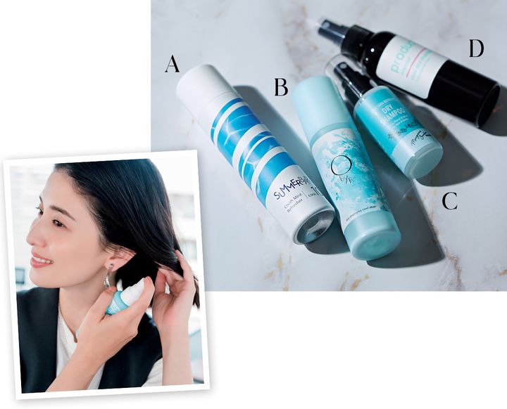 A 炭酸濃度10,000ppm。凍るような冷たさで熱い頭皮をケア。サマーバー クラッシュミント リフレッシャー クール 10 70g¥1,540(夏季限定、デミ コスメティクス)B ベタつきや臭いの元を吸着して軽やかな髪に。冴える冷感がじわじわと持続。O by F スキャルプドライシャンプー クールショット 100ml ¥2,420※数量限定(ビープル)C スーッと冷やしながらペタッとした前髪をふんわりリペア。前髪専科さらさらリフレッシュドライシャンプー 60ml ¥1,100(ハーベス)D 冷感がパワーアップ。スプレーした瞬間に肌温度-5℃を叶える。ザ・プロダクト クールドライシャンプーff 115ml¥1,430(KOKOBUY)