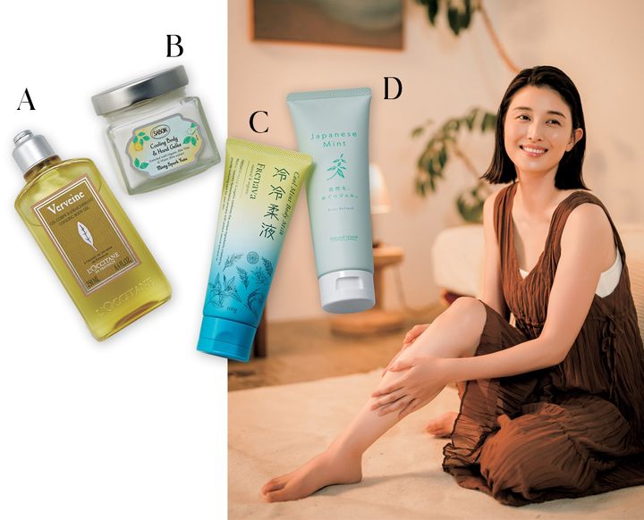 A みずみずしいジェル。冷蔵庫で冷やすとさらにクールに。ロクシタン ヴァーベナ アイシーボディジェル 250ml ¥4,730※数量限定(ロクシタン ジャポン)B 清涼感のあるフレッシュな使い心地。ボディ&ハンドジュレ スパークリング・ユズ 200ml¥5,060※数量限定(SABON Japan)C 和種ハッカ由来のメントールでパワフルな冷涼さが持続。FRENAVA natural & organic クールミントボディミルク 冷冷柔液 100g ¥2,200※数量限定(ビープル)D 爽快感に包まれて巡りをサポート。自然なめぐりジェル。リフレッシュジェルクリーム 120g ¥2,310(ナチュラルアイランド)