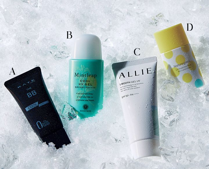 A 【Face】毛穴、色ムラ、凸凹をカバーして崩れにくい。ケイト ザBB(クール&カバー) 全2色 SPF24・PA+++ ¥1,540※数量限定〈編集部調べ〉(カネボウ化粧品)B 【Body】シャキッとした冷たさで暑い日も快適なボディ用UV。ミントリープ クール UVジェル SPF50+・PA++++ 40ml ¥1,650 (ハウス オブ ローゼ)C 【Body&Face】軽やかに広がり、ベタつかず快適。アリィー クロノビューティ スムースジェルUV SPF50+・PA++++ 60g ¥2,310※数量限定〈編集部調べ〉(カネボウ化粧品)D 【Face】レモンの香りが爽やか。トーンアップしながらひんやり。UVプロテクションベースML SPF50+・PA+++ 30ml ¥3,740(数量限定、ナチュラグラッセ)