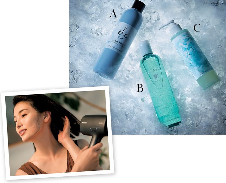A ミント配合でクールな使用感。ベタつきをリフレッシュ。ele cuir スリーエレメントシャンプー M&L 300ml ¥2,970※数量限定(ビープル)B 弾力泡で爽快に洗い上げる。ダメージを受けた髪にも優しい弱酸性。ラ・カスタ アイシーアロマ ヘアソープ 300ml ¥2,420※数量限定(アルペンローゼ)C 頭皮のこもり熱をリセット。頭皮ケア、トリートメントも叶う3in1シャンプー。O by F スキャルプシャンプー クール 200ml ¥3,080※数量限定(ビープル)