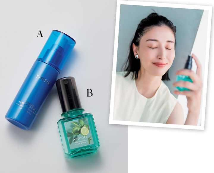 A 細かなミストがふわっと広がる。ティルティル マスクフィット メイクアップクールフィクサー80ml ¥1,650(D&ACE)B 爽やかに肌を包み込みメイク崩れをガード。シルキーフィニッシュミスト ライム&ミントの香り 50ml ¥1,925(数量限定、アテニア)