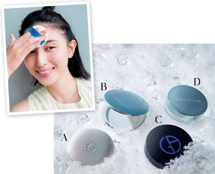 A 色ムラやテカリを防いでしっとりふわ肌に。サナ 素肌記念日 スキンケアパウダー N 01 アイスピーチティーの香り 10g ¥1,650※限定〈編集部調べ〉(常盤薬品工業)B 心地よい清涼感でほてりを抑制。サラすべ肌をキープ。アンプルール フェイスパウダー クール SPF50+・PA++++ 10g ¥5,280(数量限定、アンプルール)C スキンケアエッセンスを約30%閉じ込めたパウダーが弾けて、ひんやりしたつけ心地。デザイナー ルース パウダー ¥9,680(アルマーニ ビューティ)D ふわっとムラなく広がり透明感アップ。UVフェイスパウダー ミントラテ SPF50+・PA++++ 6g¥2,970(数量限定、Koh Gen Do)