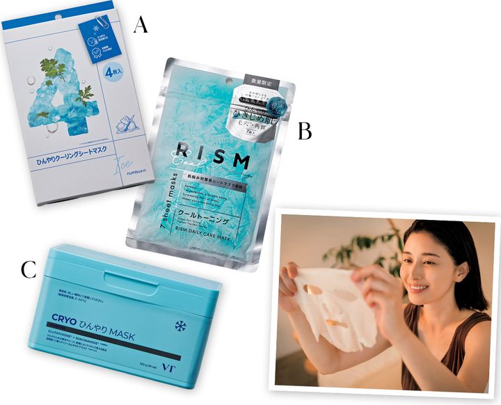 A ひやっとした冷感で肌温度を下げて炎症を鎮める。numbuzin 4番ひんやりクーリングシートマスク 4枚入り ¥1,090(Benow)B シート自体が冷たい新素材アイスシートを採用。リズム デイリーケアマスク クールトーニング 7枚入り ¥880※数量限定(サン・スマイル)C ひんやり感エッセンスが角質層に浸透し、内側からうるおいをプラス。クライオひんやりマスク 30枚入り ¥2,420(VT COSMETICS)