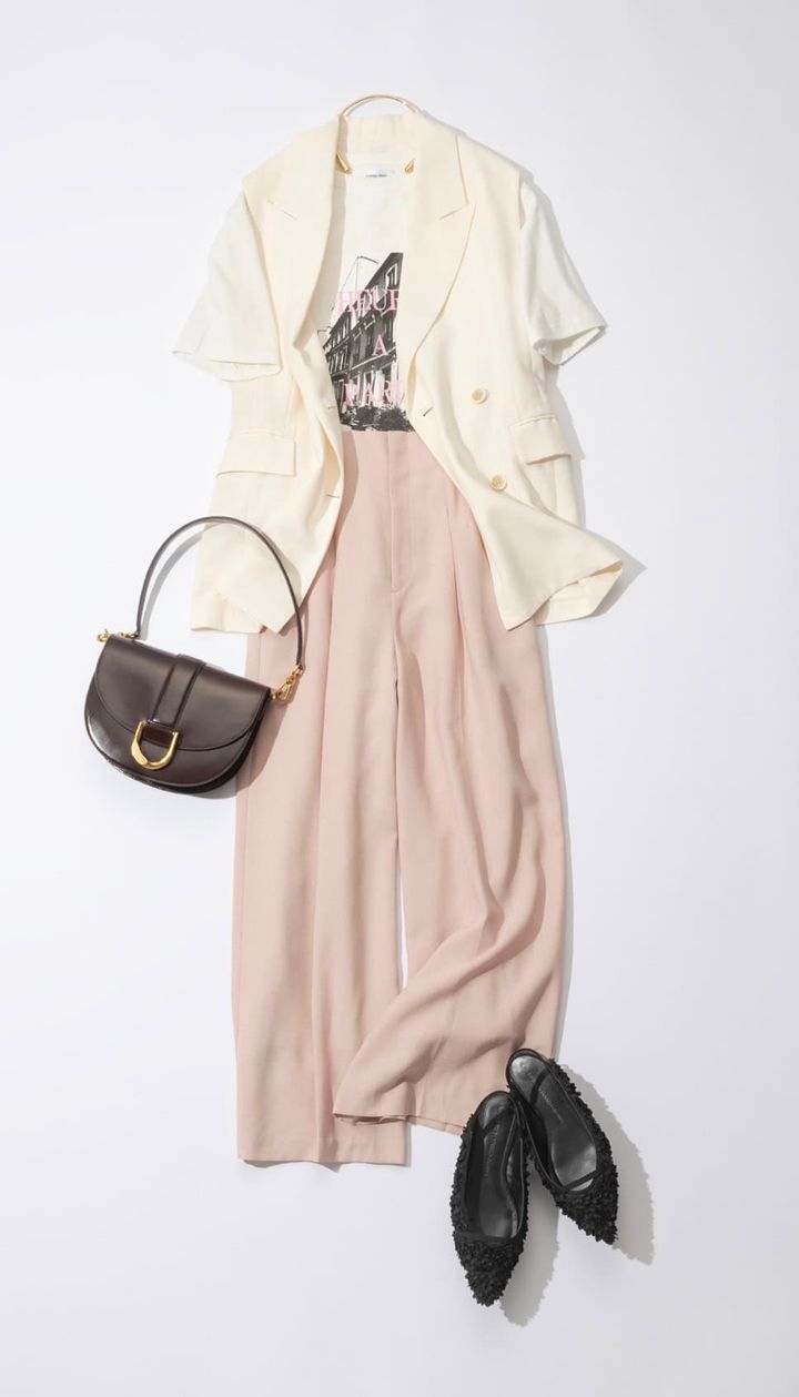 【25℃】ワンツーコーデにも飽きてきた9月、Tシャツ×ジレも白で繋げればスッキリ見えです。ピンクのワイドパンツにボルドーのバッグ合わせで、甘ニッシュな気分を盛り上げて。足元はモコモコ素材が可愛いシューズで秋らしさも投入します。