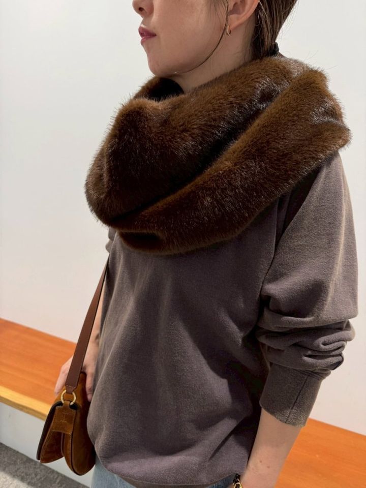 「私の世代ではちょっと懐かしいファースヌード。近年ECOファーのクオリティーがかなり上がっていて、ソフトさとリッチな毛足がリアルと見間違えるほど。秋口はシャツやロンTに、冬はニットやアウターにちょい足しするだけで手持ちの洋服の着こなしに鮮度が加わります」ファースヌード¥26,400(BRILL/BRILL新宿店)