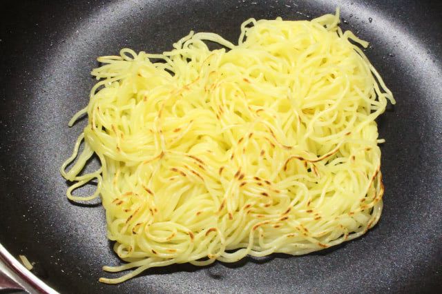 焼きそば麺をあまり触らずに2分ほど焼いてひっくり返すと、一部にこんがりと焼き色が付きました。反対の面も2分ほど焼きました。