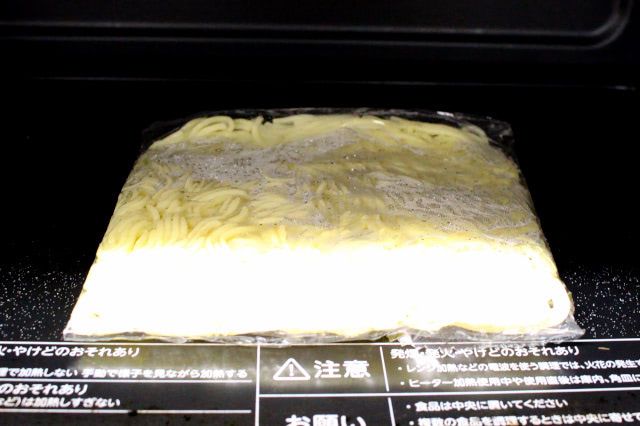 1. 焼きそばの袋に小さな穴を数か所開け、電子レンジ(600W)で1分ほど加熱します。